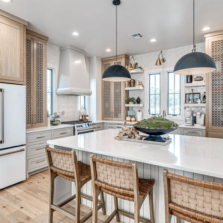 Through a wide arched opening, you’ll find the chef’s kitchen, a true showpiece of Hideaway 56. A large island anchors the space, surrounded by Café brand appliances in white and gold, including a double oven, six-burner gas range, and oversized stainless steel sink. Every drawer is neatly labeled and fully stocked with cookware and utensils. A Keurig and 12-cup Café coffee maker give you options for your morning brew. Three woven barstools at the island make it easy to chat with the cook, and the dining nook nearby comfortably seats ten, creating a bright, open space where cooking, dining, and laughter all flow together.